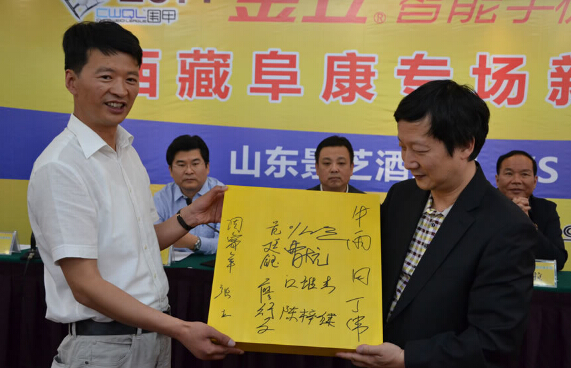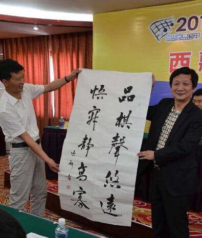 發(fā)布會最后曹大元九段代表兩隊棋手像王斌贈送國手簽名的棋盤,王斌則用三幅字回贈兩隊。