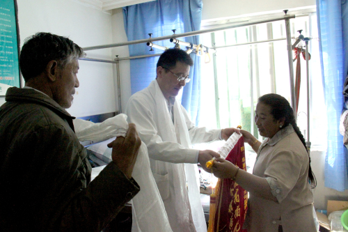 患者及家屬在出院當(dāng)天,對我院的骨科醫(yī)生獻上哈達,錦旗表達了感謝之情。