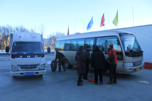 19日清晨7時,滿載物資的貨車本應(yīng)準時從拉薩市出發(fā),前往日喀則目的地,但剛準備出發(fā),我們的貨車卻因天氣寒冷,在香格里拉酒店的坡道上熄火。天氣太冷,發(fā)動機打不著火,這可急壞了大家伙,當下,大家紛紛下車,一起推車。所幸,最終貨車重新啟動!可在汽車行駛至拉薩機場附近時,我們的客車又被利物刺破了前輪,并且由于天色尚早,附近的幾處修理廠皆是大門緊閉,尚未開門,好在加油站的工作人員替我們打了電話,找來了一位修車師傅!