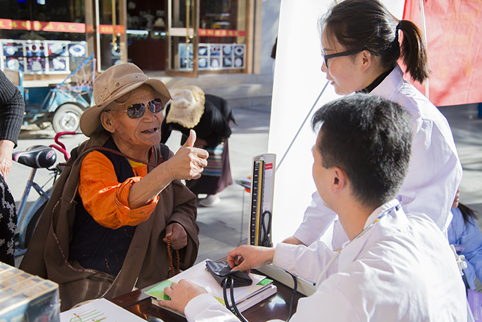 在活動(dòng)期間,前來阜康醫(yī)藥義診宣傳點(diǎn)的藏族同胞及社會(huì)群眾紛紛表達(dá)了自己對(duì)阜康醫(yī)藥全體員工的感謝,一位年齡較大的藏族老伯前來測(cè)量完血壓并咨詢了一些自己身體健康方面的問題之后,更是再三對(duì)阜康醫(yī)藥的醫(yī)護(hù)人員表達(dá)了謝意,并且毫不吝嗇贊美之情地對(duì)我們豎起了大拇指!西藏自治區(qū)德吉副主席等幾位領(lǐng)導(dǎo)在本次活動(dòng)巡查工作中,于阜康醫(yī)藥免費(fèi)義診宣傳點(diǎn)與我院醫(yī)護(hù)人員等進(jìn)行了交流,并再次表達(dá)了對(duì)阜康醫(yī)藥長(zhǎng)期以來積極參與各項(xiàng)活動(dòng)、傾情奉獻(xiàn)社會(huì)民族、熱心回饋西藏百姓的誠(chéng)摯的感謝。
