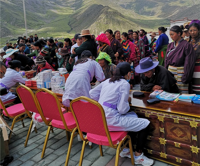 當(dāng)天上午,全國(guó)婦聯(lián)宣傳部、自治區(qū)婦聯(lián)、拉薩市婦聯(lián)、那曲市婦聯(lián)一行來(lái)到安置點(diǎn)為群眾贈(zèng)送了藏漢雙語(yǔ)書(shū)籍。阜康義診工作隊(duì)也來(lái)到現(xiàn)場(chǎng)為安置點(diǎn)居民量血壓、檢查病情并詢(xún)問(wèn)身體情況,耐心細(xì)致地為群眾分析病情、講解日常衛(wèi)生保健、合理用藥等衛(wèi)生常識(shí),認(rèn)真解答關(guān)于常見(jiàn)病、多發(fā)病的預(yù)防診治及愈后注意事項(xiàng)。僅一個(gè)上午時(shí)間就為100余名安置點(diǎn)群眾開(kāi)展了問(wèn)診、聽(tīng)診、答疑、測(cè)血壓和健康知識(shí)宣傳,免費(fèi)發(fā)放各類(lèi)藥品價(jià)值4萬(wàn)余元 。