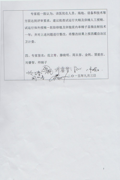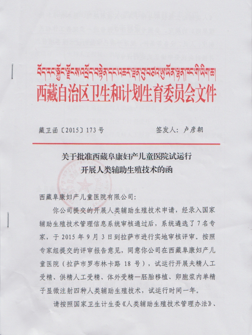 你公司提交的開展人類輔助生殖技術(shù)申請,經(jīng)錄入國家輔助生殖技術(shù)管理信息審核通過后,系統(tǒng)遴選了7名專家,于2015年9月3日到拉薩市進(jìn)行實(shí)地審核評審。按照專家組提交的評審報(bào)告意見,同意你公司在西藏阜康婦產(chǎn)兒童醫(yī)院(拉薩市羅布林卡路18號(hào)),試運(yùn)行開展精子人工受精、供精人工受精、體外受精-胚胎移植、卵胞漿內(nèi)單精子顯微注射四種人類輔助生殖技術(shù),試運(yùn)行時(shí)間一年。