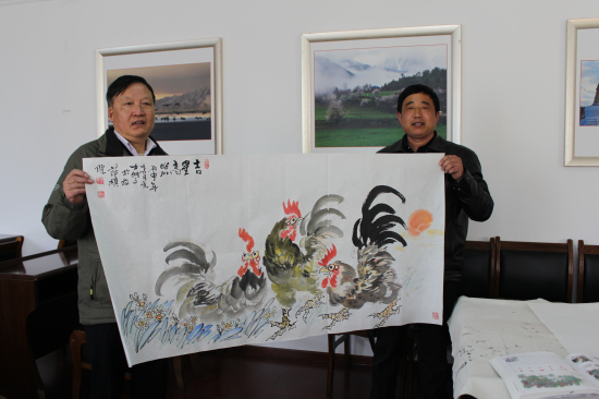 交流會(huì)上陳明文先生展示了自己的近期作品,韓書力主席贊其作品妙筆丹青、活靈活現(xiàn)、入木三分。沈開運(yùn)主席代表自治區(qū)文聯(lián)收錄了陳明文畫作《吉星高照》并贊其筆下公雞活靈活現(xiàn)、出神入化。