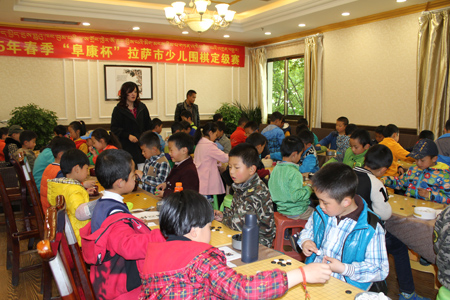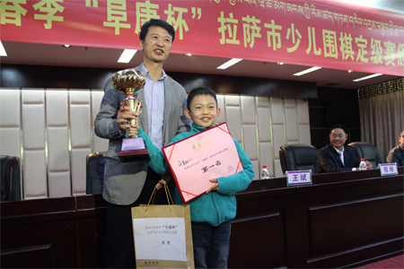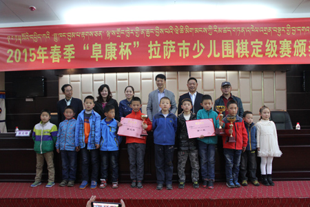 3月25日比賽結(jié)束后“復(fù)康杯”少兒圍棋定級賽頒獎儀式開始,拉薩棋院院長王斌、西藏阜康醫(yī)藥發(fā)展有限公司總經(jīng)理劉瀟瀟、西藏阜康醫(yī)藥發(fā)展有限公司總經(jīng)理陳彬、拉薩棋院圍棋部副主任趙鈞以及棋院老師陳學(xué)滸、袁文琴出席了本次會議。 王斌院長在頒獎儀式表示,很高興能夠舉辦拉薩市首屆“阜康杯”少兒圍棋定級賽,他向比賽獲勝者表示衷心的祝賀,希望他們能再接再厲繼續(xù)學(xué)習(xí)圍棋。他了解到很多家長對拉薩市棋院選址郵政賓館非常滿意,這里環(huán)境清幽,非常適合教學(xué),他當場表示郵政賓館二樓已經(jīng)被棋院斥資180萬元租賃6年,至少在6年以內(nèi)棋院不會從新選址。王斌表示,目前,拉薩棋院正在向上級有關(guān)部門申請圍棋段位資格證的相關(guān)事宜,如無意外,預(yù)計在今年年底能夠申請成功,完成圍棋段位資格證的申請,不僅能給我區(qū)圍棋事業(yè)的發(fā)展帶來很大的幫助同時也能讓我區(qū)更多的圍棋愛好者參與到此次項目。