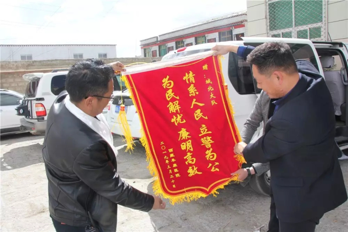 為拉薩市公安局交通警察支隊城北大隊送去錦旗和20箱礦泉水