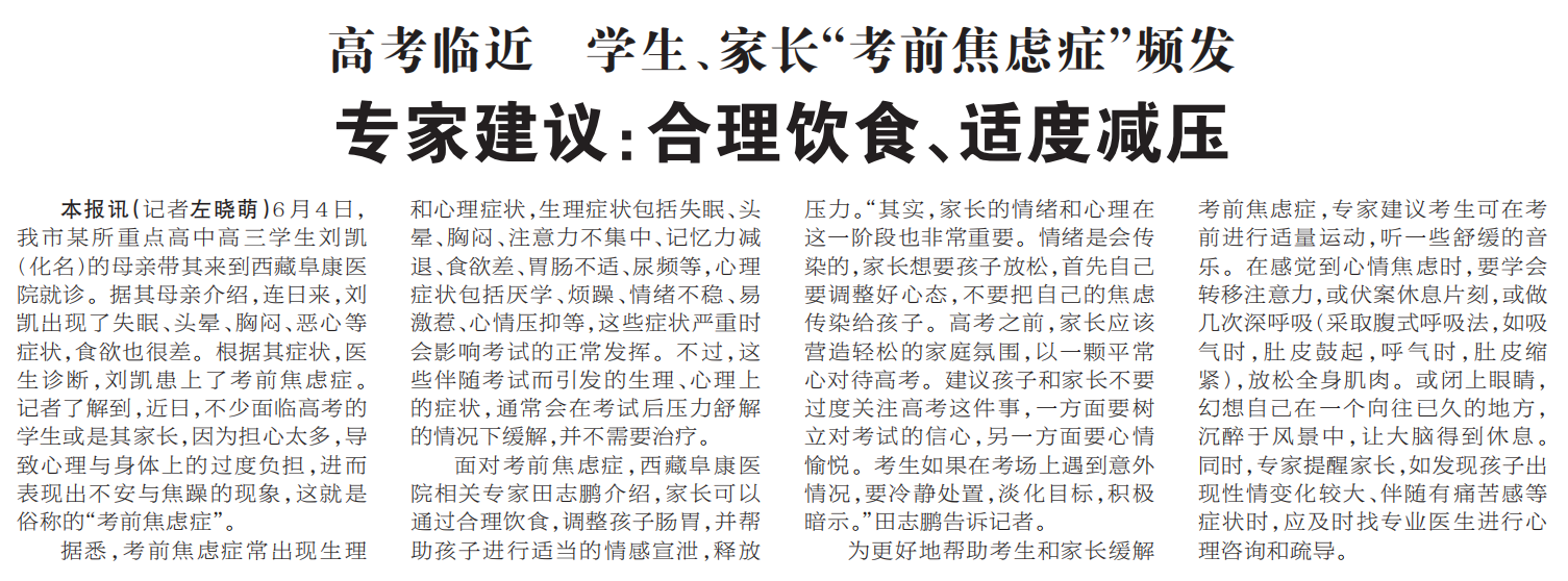 面對考前焦慮癥,西藏阜康醫(yī)院相關(guān)專家田志鵬介紹,家長可以通過合理飲食,調(diào)整孩子腸胃,并幫助孩子進行適當?shù)那楦行?,釋放壓力?ldquo;其實,家長的情緒和心理在這一階段也非常重要。情緒是會傳染的,家長想要孩子放松,首先自己要調(diào)整好心態(tài),不要把自己的焦慮傳染給孩子。高考之前,家長應該營造輕松的家庭氛圍,以一顆平常心對待高考。建議孩子和家長不要過度關(guān)注高考這件事,一方面要樹立對考試的信心,另一方面要心情愉悅。考生如果在考場上遇到意外情況,要冷靜處置,淡化目標,積極暗示。”田志鵬告訴記者。