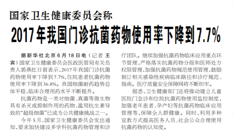 據(jù)新華社北京6月18日電 (記者 王賓) 國家衛(wèi)生健康委員會(huì)醫(yī)政醫(yī)管局有關(guān)負(fù)責(zé)人郭燕紅日前表示,2017年我國門診抗菌藥物使用率下降到7.7%,住院患者抗菌藥物使用率下降到36.8%。我國細(xì)菌耐藥趨勢總體平穩(wěn),臨床合理用藥水平不斷提升。