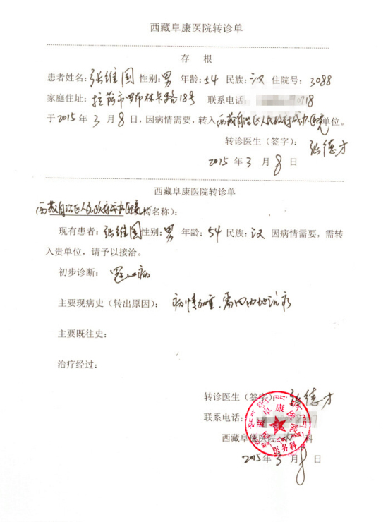 1、凡通過西藏阜康醫(yī)院轉診到西藏自治區(qū)人民政府成都辦事處醫(yī)院就診的患者,需前往阜康醫(yī)院領取“轉診單”,或在線下載,蓋阜康醫(yī)院公章后,持“轉診單”前往成辦醫(yī)院就診;