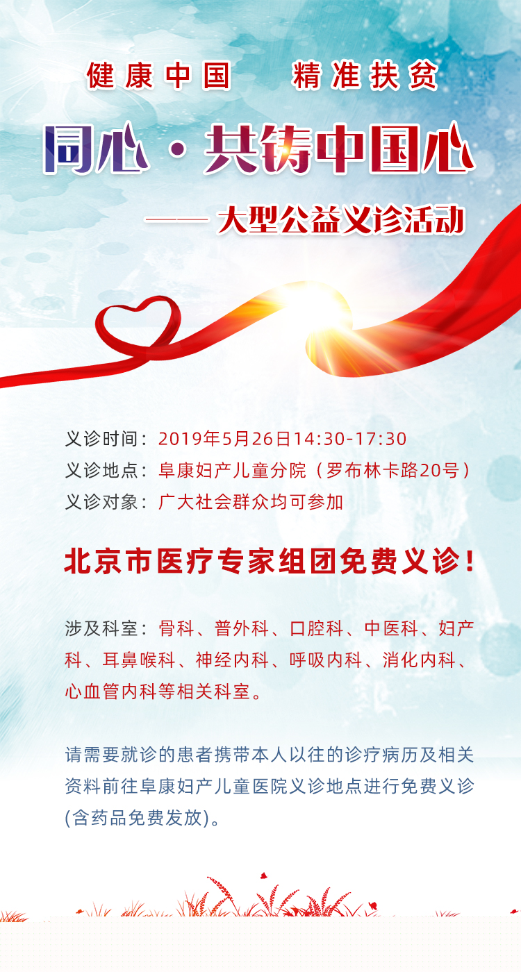 “同心·共鑄中國心”活動是一項愛心工程,此次義診匯聚北京醫(yī)療機構的知名專家,請需要就診的患者攜帶本人以往的診療病歷及相關資料前往阜康婦產兒童醫(yī)院義診地點進行免費義診(含藥品免費發(fā)放)。