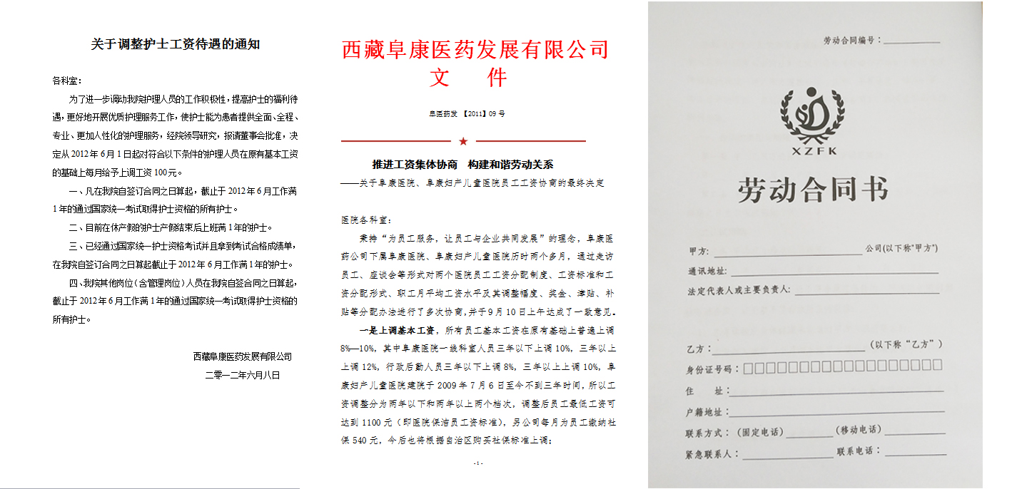 近年來,西藏阜康醫(yī)療股份有限公司高度重視工資集體協(xié)商工作,始終堅(jiān)持以人為本,維護(hù)職工合法權(quán)益,認(rèn)真貫徹《集體合同規(guī)定》。實(shí)行院務(wù)公開,發(fā)揮職代會作用,認(rèn)真聽取員工在工資集體協(xié)商方面的意見和建議,根據(jù)需要召開職代會聯(lián)席會議,建立穩(wěn)定的分配機(jī)制和增資機(jī)制,保障了員工對公司工資分配的知情權(quán)、協(xié)商權(quán)和監(jiān)督權(quán)。認(rèn)真履行《勞動合同》,設(shè)立了員工養(yǎng)老、醫(yī)療、工傷、生育、失業(yè)等保險,并足額上繳到位。