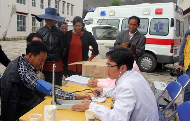 通過(guò)為尼木縣鄉(xiāng)村小學(xué)老師們的體檢,董發(fā)善醫(yī)生說(shuō):“大部分老師都患有血管神經(jīng)性頭疼和不同程度的胃病和膽囊疾病。這是由于在鄉(xiāng)村學(xué)校中,老師們工作繁忙,經(jīng)常忘記吃飯或者到了吃飯的時(shí)候就湊合吃幾片風(fēng)干肉,喝幾杯酥油茶。這是造成鄉(xiāng)村老師腸胃和膽囊疾病的主要原因。此外,由于老師們經(jīng)常站著講課,腰椎疾病的患病率比其他行業(yè)的要高。”在體檢的同時(shí),醫(yī)護(hù)人員還向老師們發(fā)放了常見(jiàn)疾病預(yù)防知識(shí)的宣傳材料。