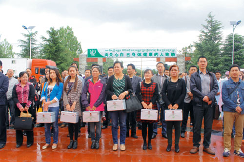 西藏阜康(國際)健康體檢中心王斌董事長首先向?yàn)榇龠M(jìn)西藏和諧發(fā)展長期駐村(居)的工作人員表示崇高的敬意!據(jù)了解,本次為拉薩市267個駐村(居)工作隊(duì)贈送的小藥箱中配備了急救類、解熱鎮(zhèn)痛類、治感冒類、止咳化痰類、抗菌藥物類等14類共31種常用藥品及電子血壓計(jì),總價值約20萬元。王斌董事長在贈送儀式上講到“本次開展西藏阜康(國際)健康體檢中心向駐村(居)工作隊(duì)贈送藥箱活動,旨在為民解困難,為民辦實(shí)事,為我們駐村(居)工作人員健康做好堅(jiān)實(shí)的后盾,促進(jìn)西藏穩(wěn)定和諧發(fā)展。”王斌董事長希望能給駐村(居)工作人員帶來健康,同時也希望能在黨的群眾路線教育實(shí)踐活動中獻(xiàn)出民營企業(yè)的一份綿薄之力。