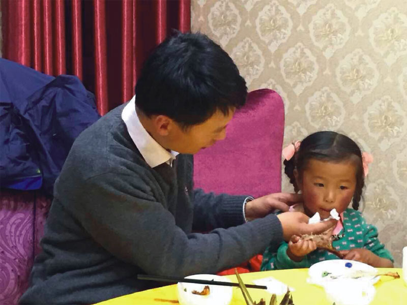 和小卓瑪?shù)臅r光是快樂而短暫的,剛相聚時,你是那么膽小怕生的,“阿爸”為你穿上新衣服,你開心。“阿爸”對你是那么疼愛、牽掛,把你緊緊抱在懷里,為你剝糖紙,為你卷衣袖,帶你進城看震后城市的新貌,帶你吃大餐,為你擦鼻涕,為你拿你喜愛吃的肉,為你擦手上衣服上的油漬,帶你嬉戲歡天喜地,逗你開心,此時的他,已不再是擁有八百多號員工的企業(yè)董事長,他就是你的“阿爸”,一個認(rèn)為和你在一起時光太短的“阿爸”。