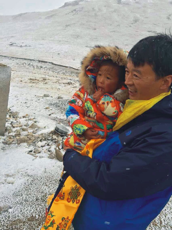 車子越來越近,透過車窗,遠遠白雪寒風(fēng)中,早已屹立著高矮大小幾人,是奶奶、媽媽、舅舅和天真的你,手捧著圣潔神圣的黃色哈達,似盼望著許久不見的家人的歸來,車外的寒風(fēng)很冷,有點刺骨。見到親人的到來,奶奶急忙上前為他獻上祝福吉祥的哈達并雙手合十置于額上,隨后牽過身旁的女孩——玉康卓瑪,個子不高,比同齡孩子稍消瘦矮小,一張稚嫩的蘋果臉蛋兒上深深的高原紅,給人留下深刻印象。他滿懷憐愛地抱起了玉康卓瑪,年僅4歲的她并不會說漢語,更是未曾見過他,可愛害羞甚至有點怕生的小卓瑪卻對著他喊了聲“阿爸”。此時,奶奶正在為次仁(我們同行的伙伴,是當(dāng)時參加玉樹抗震救災(zāi)且參與了接生小卓瑪?shù)淖o士之一)獻哈達。瞬間,空氣似乎凝固了幾秒,突然,奶奶兩行淚水徑直流了下來。此情此景觸人心懷,兩兩相擁,無聲地流著熱淚。是感恩,是親人,是多年來他一直履行承諾的感激,是為他不畏千里迢迢尋找來看望的感動,如同失散多年的親人再度相逢。