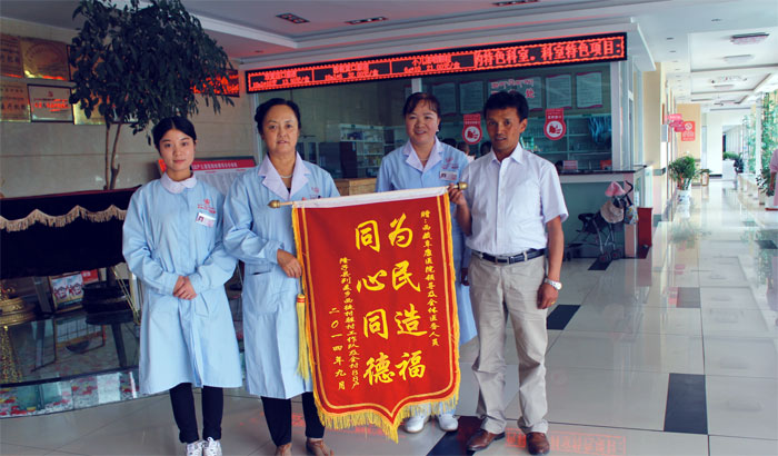 2014年阜康義診隊奔赴山南地區(qū)隆子縣開展免費義診送醫(yī)送藥活動,共有300多名村民就診,發(fā)放藥品2萬余元。為了向阜康醫(yī)護(hù)人員表示感謝,2015年7月30日山南地區(qū)社保局醫(yī)保中心主任邊旦次仁,代表隆子縣列麥鄉(xiāng)西徒村駐村工作隊及全村88戶村民來到阜康醫(yī)院婦產(chǎn)兒童分院,為我院醫(yī)務(wù)人員送來了感謝錦旗,敖德秀院長作為院方代表接受了這份榮譽(yù)。