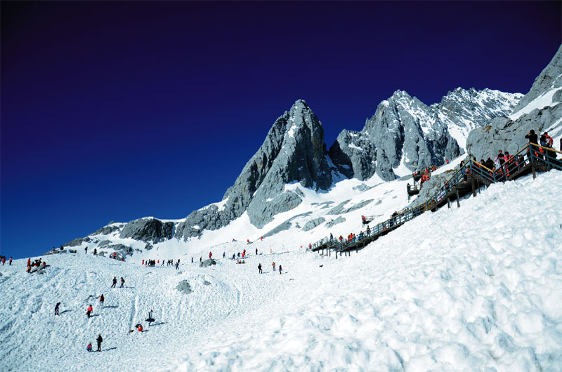 人文的掃興,索性來場自然之旅。第二天一大早我們就前往了玉龍雪山,還是被告知到達最高峰的索道票昨日售盡,我們的索道只到得了松杉坪。回憶起來,這也許值得慶幸。松杉坪松樹高聳如云,木棧道旁有積雪未化,風過樹梢的積雪隨風灑落,偶爾有小松鼠一躍而過,牦牛悠閑自在的吃著草,遠處是玉龍雪山的最高峰,仿佛近在咫尺。我想所有的生生死死都應(yīng)該在這里戛然而止,所有浮躁的靈魂都應(yīng)該在這里接受洗禮,進入輪回,拋卻紅塵暫享這片刻的永生。她是我去過最接近天堂的地方,