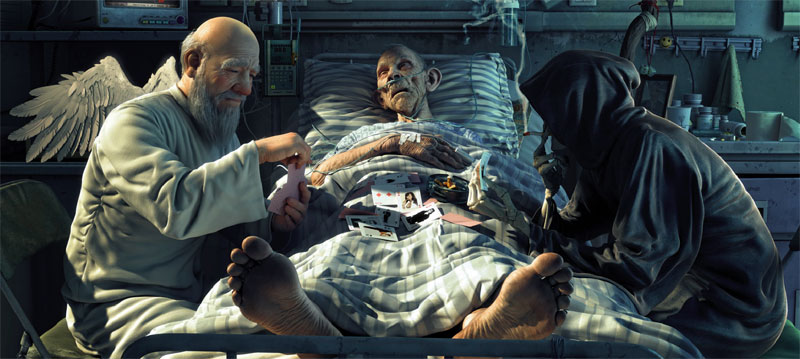 一個將死之人,在彌留之際,發(fā)現身邊坐著兩個人,魔鬼和天使。他們在床邊玩牌,并以牌局論輸贏,賭這個人的靈魂是飛到天堂,還是下到地獄。他緊張地看著牌局,不知道自己的命運會怎樣。